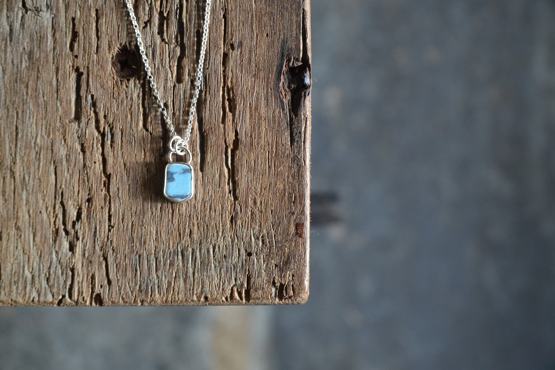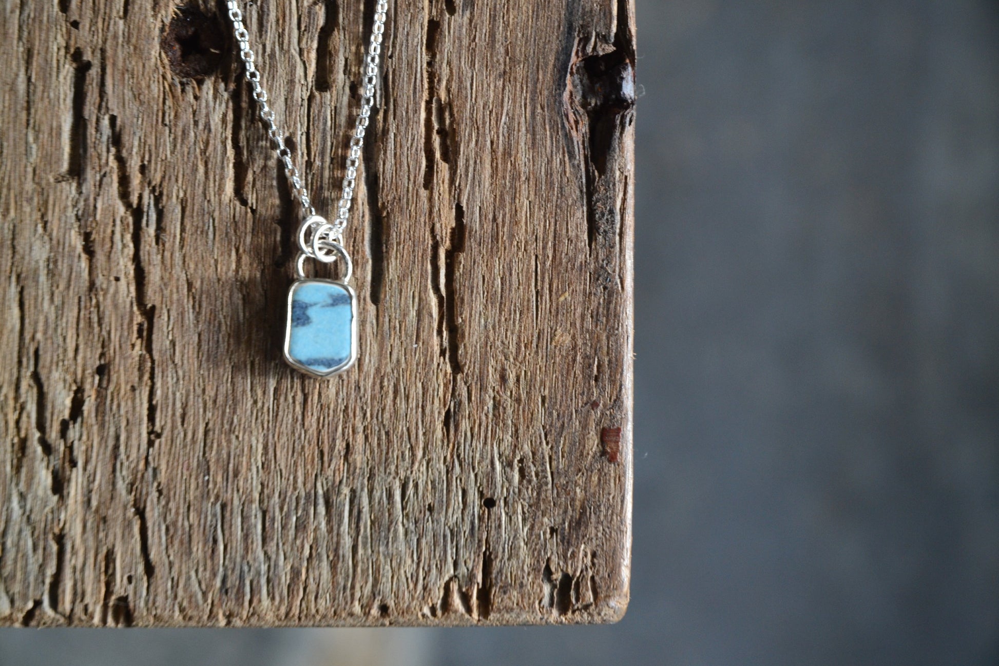 A blue Cornish sea pottery sherd in recycled sterling silver.