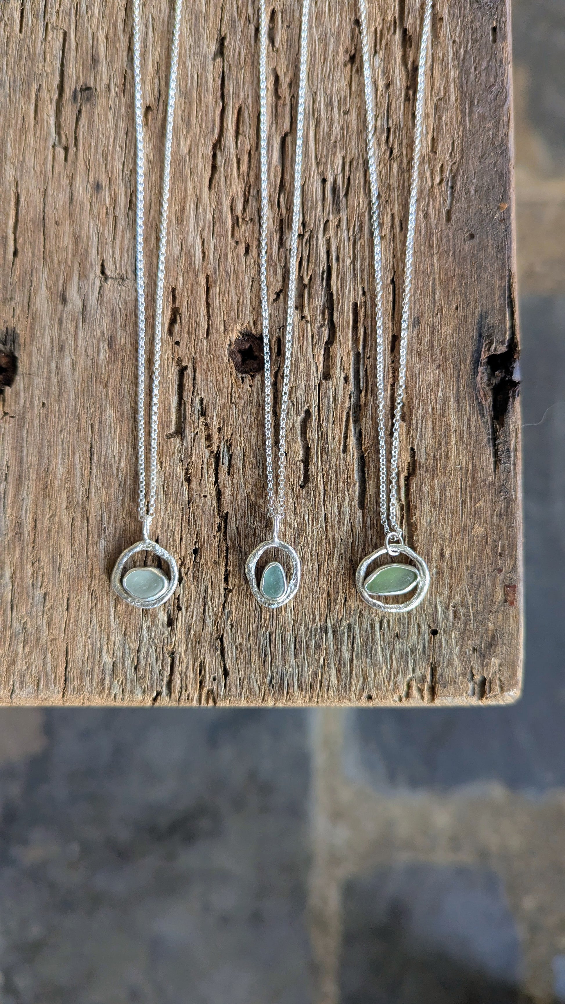 Beautiful shades of green and blue Cornish sea glass framed by molten silver. The perfect sea-inspired gift for beach fanatics and coastal swimmers.