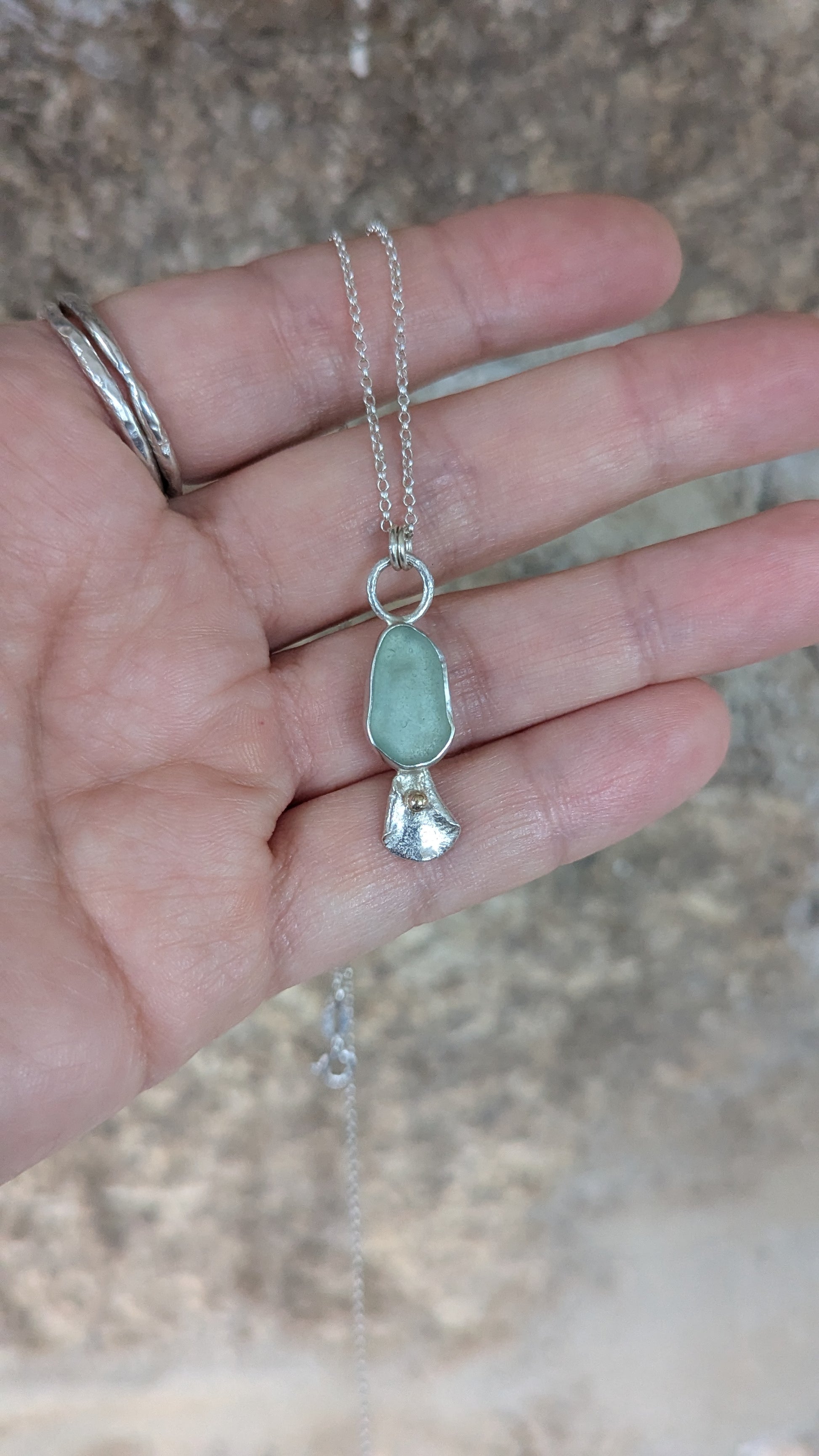 Seafoam sea glass pendant with molten silver and a 9ct gold detail.