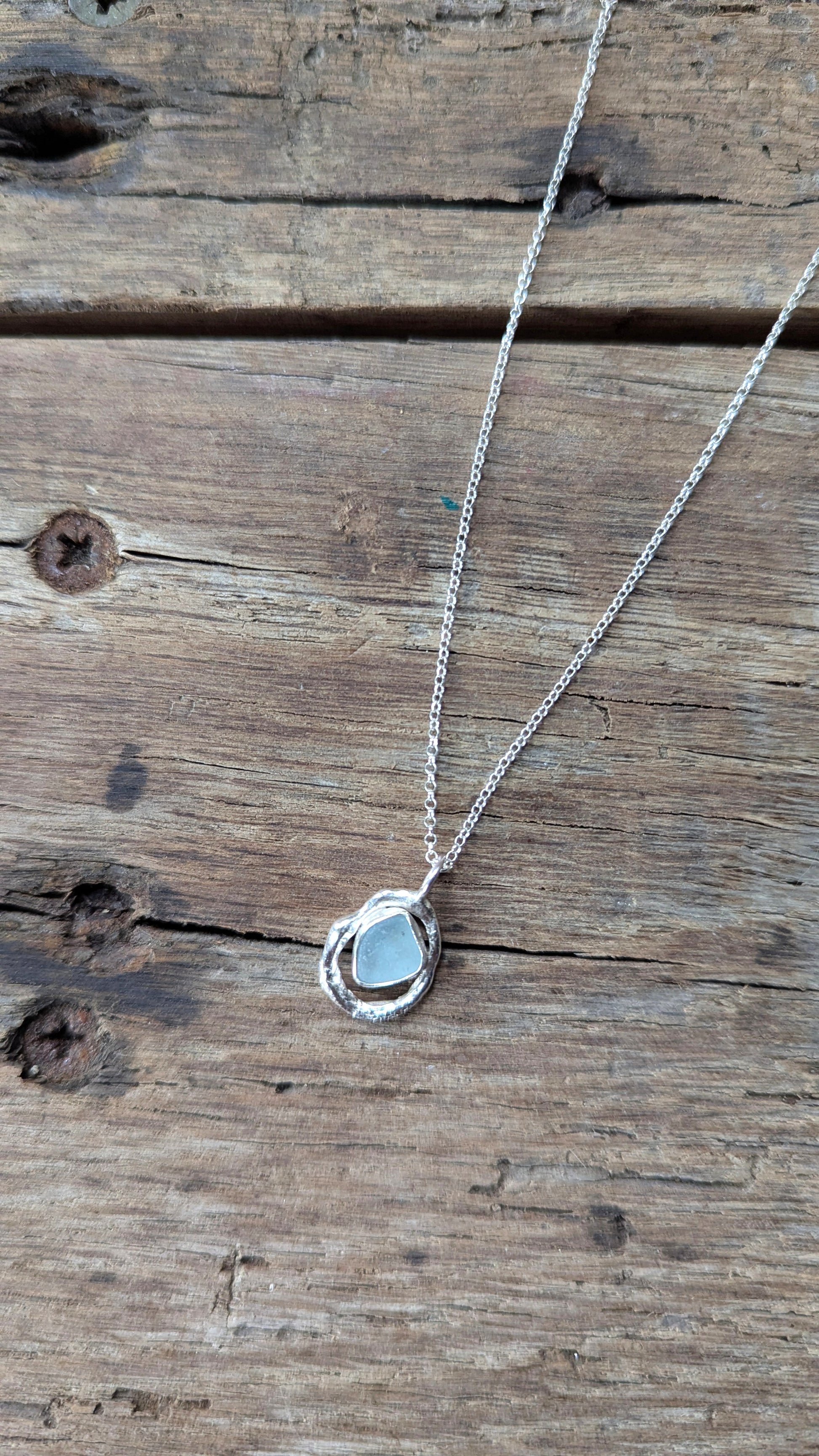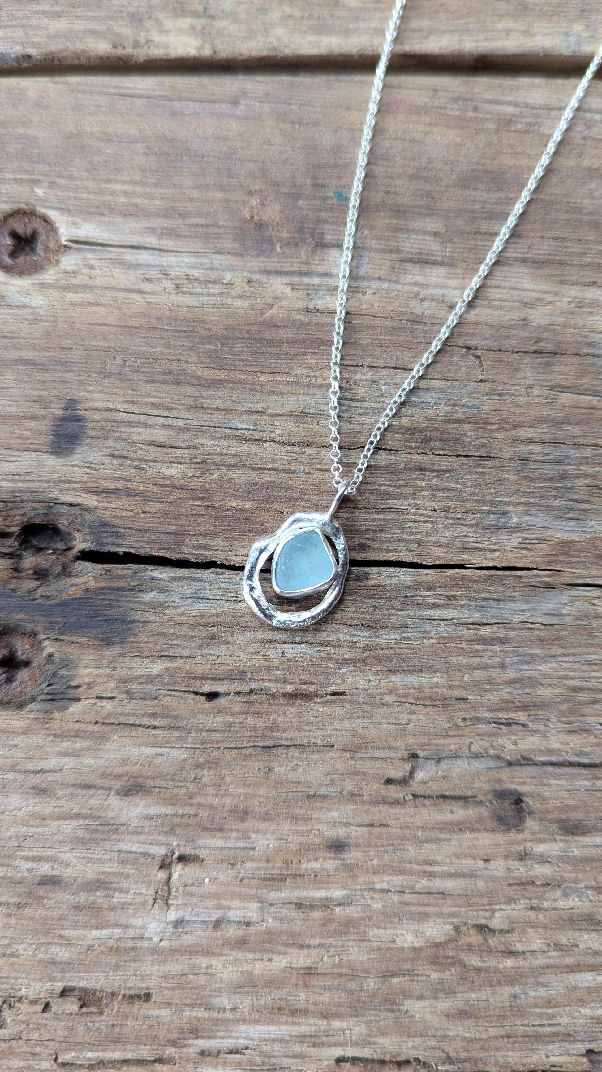 A summery light blue Cornish sea glass find, surrounded by organically textured molten silver. A one-of-a-kind necklace created in Cornwall.