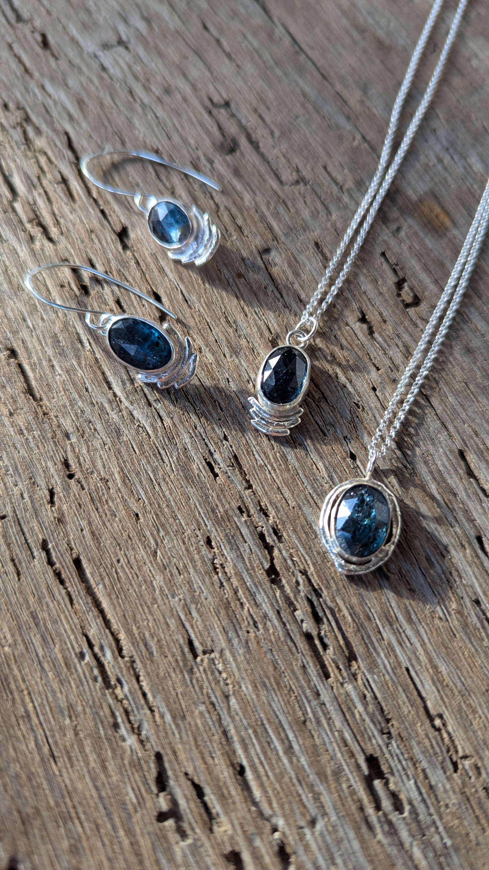 Moss Kyanite, with its freckled inclusion, is a stunning stone! This collection has been created with deep teal blue, rose-cut stones that really catch the eye. Choose from a surround of molten silver (right), or a trio of molten silver bands below (left). Each is strung from a 45cm sterling silver chain.