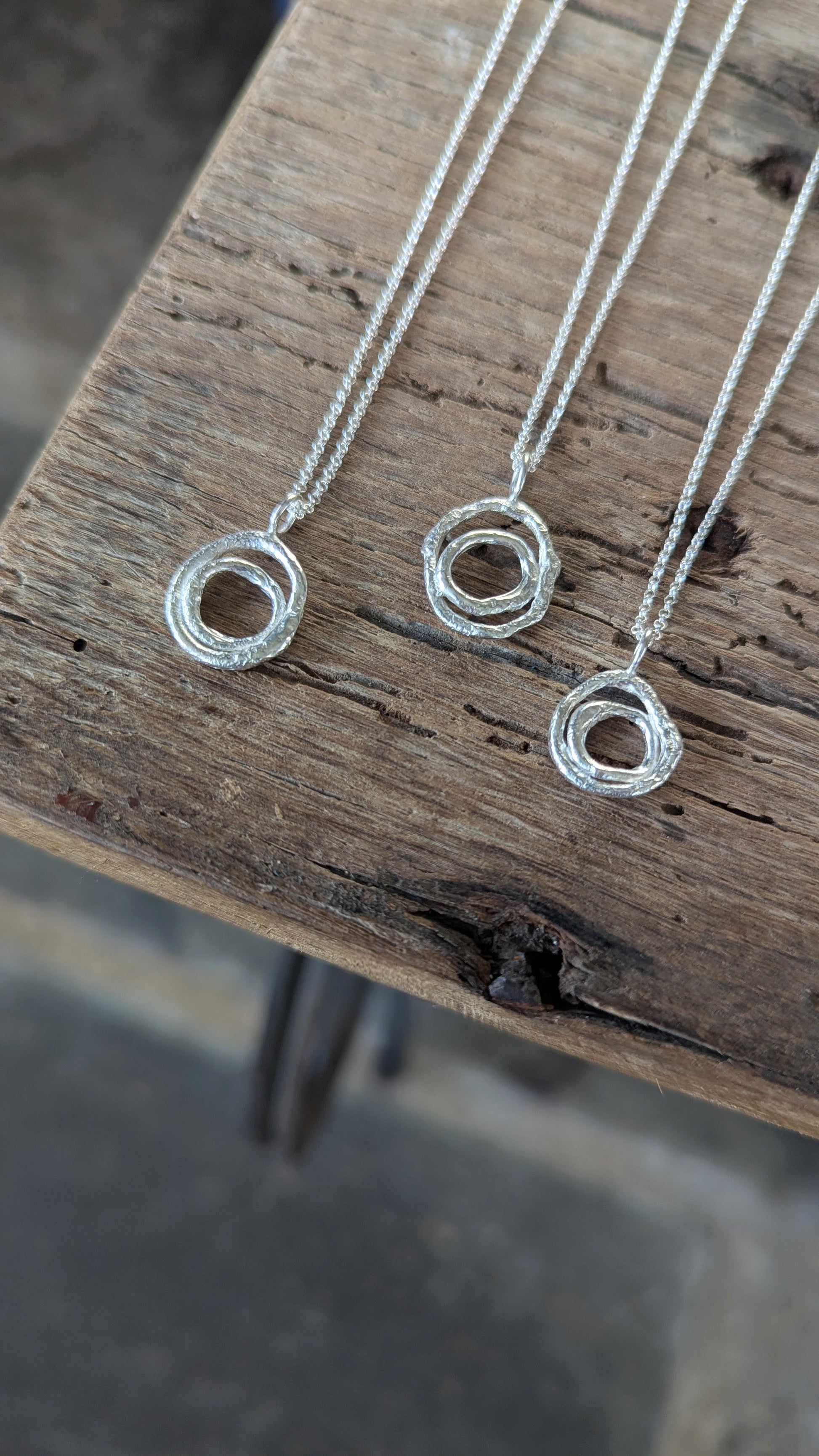 Symbolising connection, protection and unity. Two organically molten rings of recycled sterling silver have beautifully undulating textures. Each is individually handmade creating a unique pendant. The ones shown are examples.